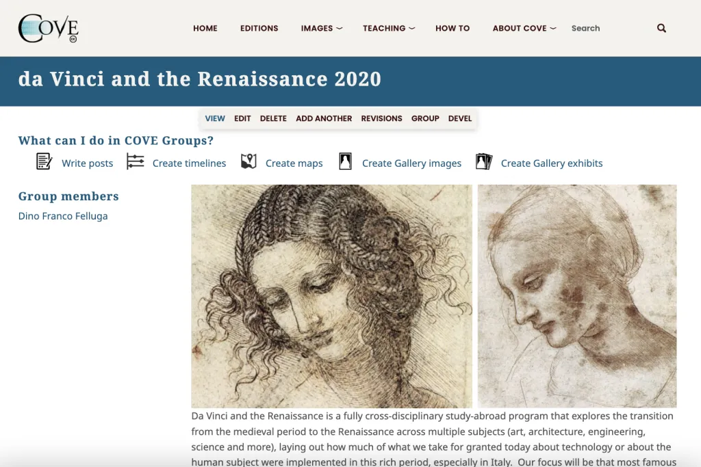 The COVE Editions environment allows for the creation of custom timelines, maps, and image galleries in collaborative groups. A group leader can set up a dashboard, from which they can add students or other members. Students can also register themselves for a group. Various privacy settings are available for each group.
